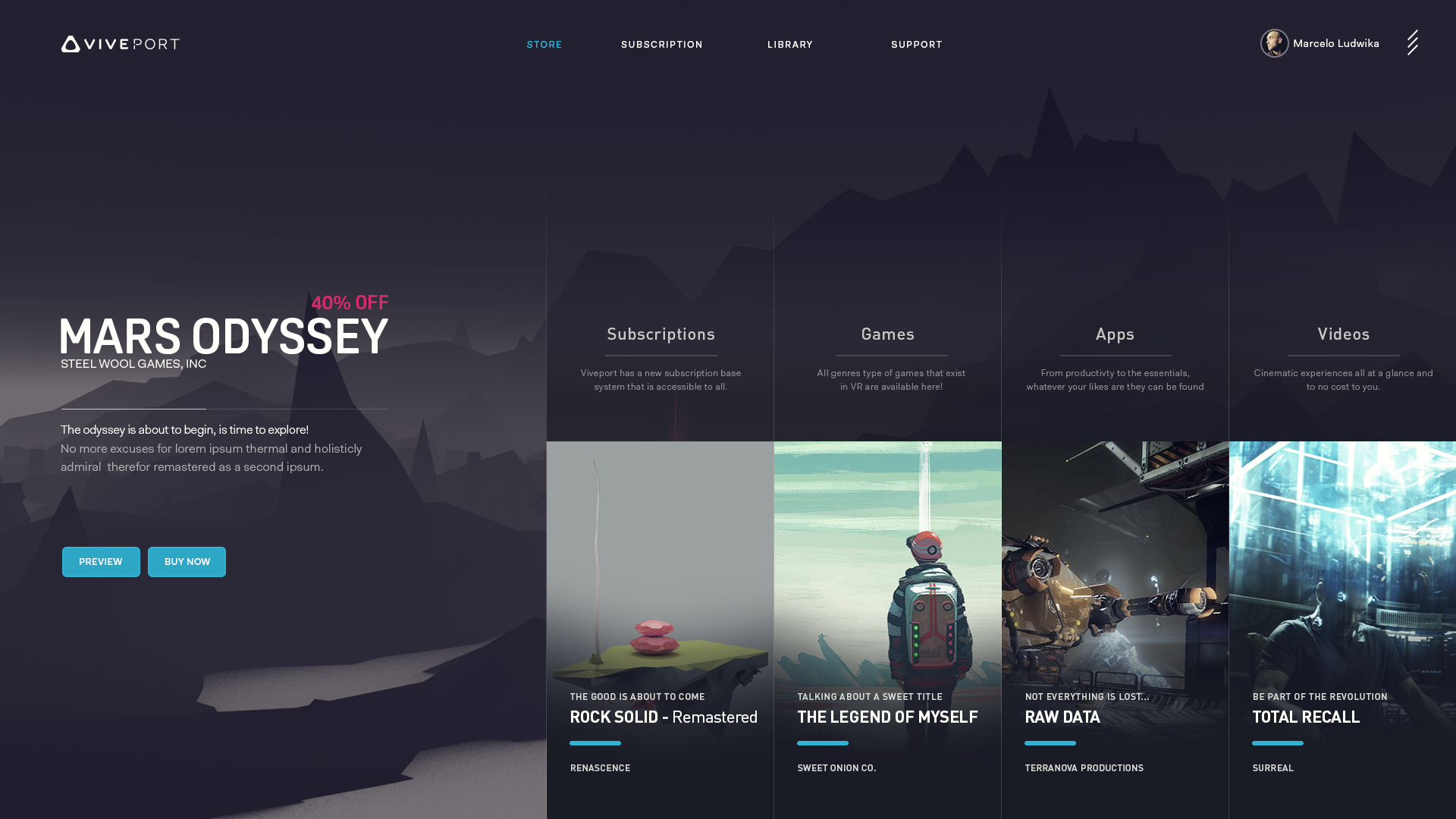 Over several years, I had the opportunity to lead a range of design initiatives for the Viveport VR Store, beginning with the initial concept and early UX storefront prototypes, which I continued to develop and refine through to the final launch. I collaborated across the full lifecycle of the project, overseeing the development of the visual identity, UX/UI systems, and immersive environmental designs that defined the storefront’s presence across both 2D and 3D VR experiences.